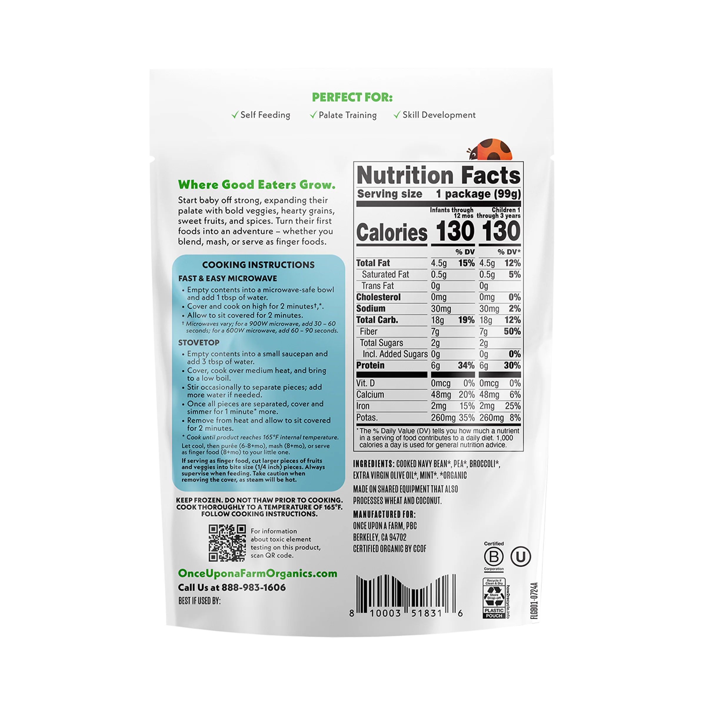 If a sun-soaked summer garden is your happy place, this farm-forward recipe is a parent’s dream come true. We pair plump peas and navy beans with small cuts of broccoli and a hint of mint to deliver the greens and protein your child needs.